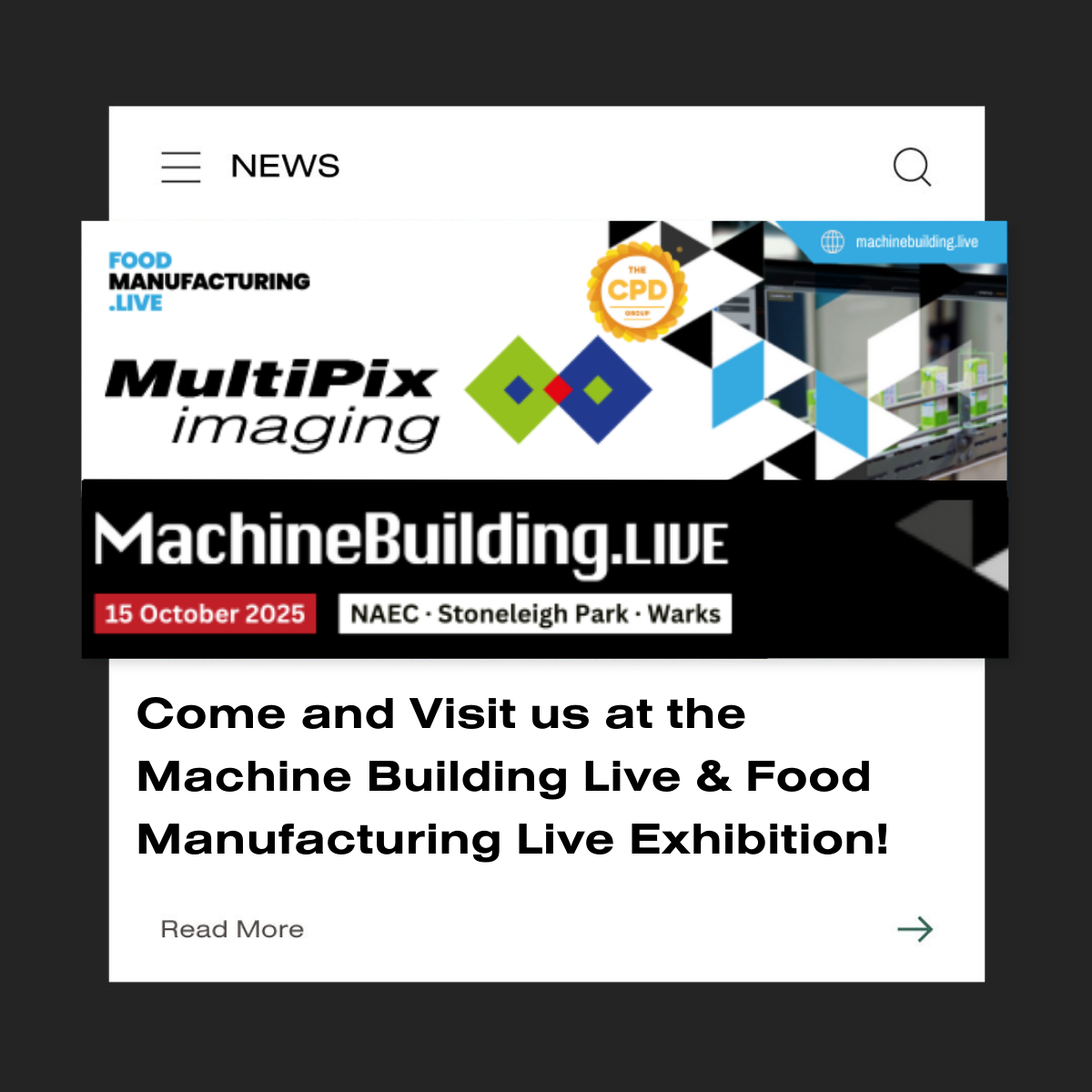 Multipix Imaging is delighted to announce that we will be exhibiting at the combined Machine Building Live and Food Manufacturing…